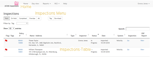 This page shows an Inspections Table, which lists the inspections assigned to you, and an Inspections Menu, which can be used to filter inspections, download PDFs and search inspections.