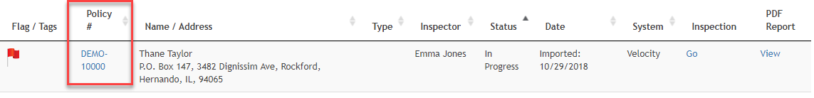 To view an Online Inspection Report go to the Home page to view your inspection list and click on the Policy Number (Policy #) of the inspection in the Inspections table